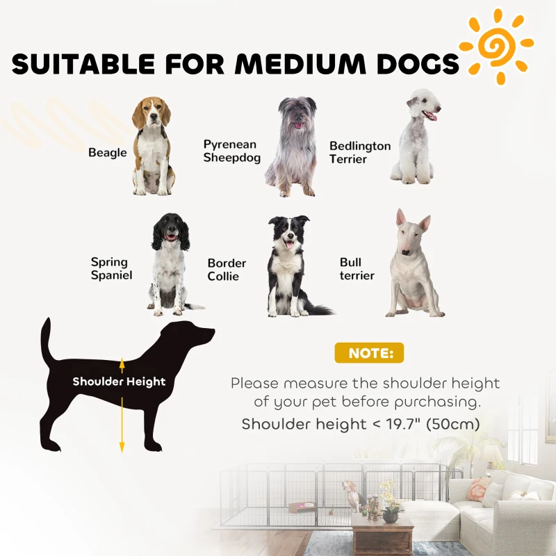 This PawHut playpen consists of twelve durable steel panels that can be arranged into flexible layouts—such as squares, rectangles, or L‑shapes—or even separated into two distinct enclosures to suit your space and needs. It stands 80 cm tall, and when set up as a square, measures roughly 204 by 204 cm, while the rectangular layout extends to about 272 by 136 cm. Each individual panel spans approximately 56 cm in width and 80 cm in height, with bar spacing of around 5 cm horizontally and 15 cm vertically. Two step-through doors each measure approximately 39 by 52.5 cm, offering easy access and secure closure via safety latches. For outdoor use, twelve ground stakes (about 90 cm long each) help anchor the structure firmly for added stability. And when not in use, the whole playpen folds compactly—down to around 80 by 70 by 18.5 cm—for effortless storage or transport.