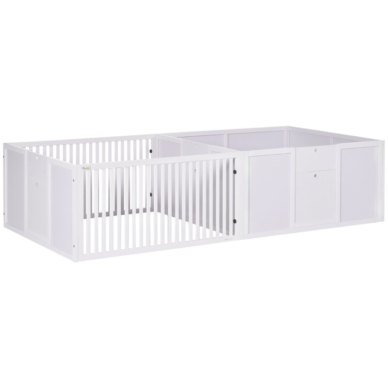 This PawHut two-room puppy playpen consists of seven sturdy steel panels that create a thoughtful dual-chamber layout—ideal for separating the mother dog and her puppies. One section is ventilated to provide fresh airflow and visibility, while the other is enclosed to offer a wind-resistant, cozy space. The two-room design includes three access doors, including a central one, making it easy for the mother to enter or exit while keeping puppies safely contained. Made from robust steel and supported by seven ground stakes for stability, this setup measures approximately 243 cm in length, 122 cm in width, and 60 cm in height, with each panel roughly 120 × 60 cm and a doorway about 53 × 41 cm. A protective fabric barrier and washable pad are included to ensure comfort and cleanliness during whelping. This thoughtfully designed whelping box blends security and convenience to create a nurturing environment for both mother and her pups.