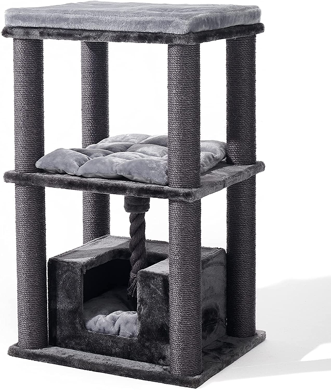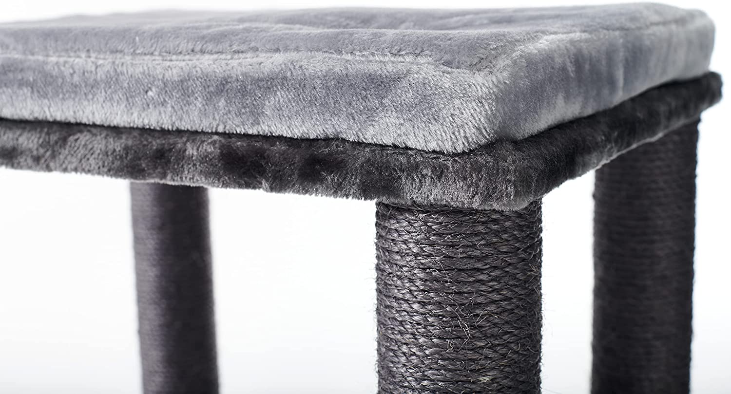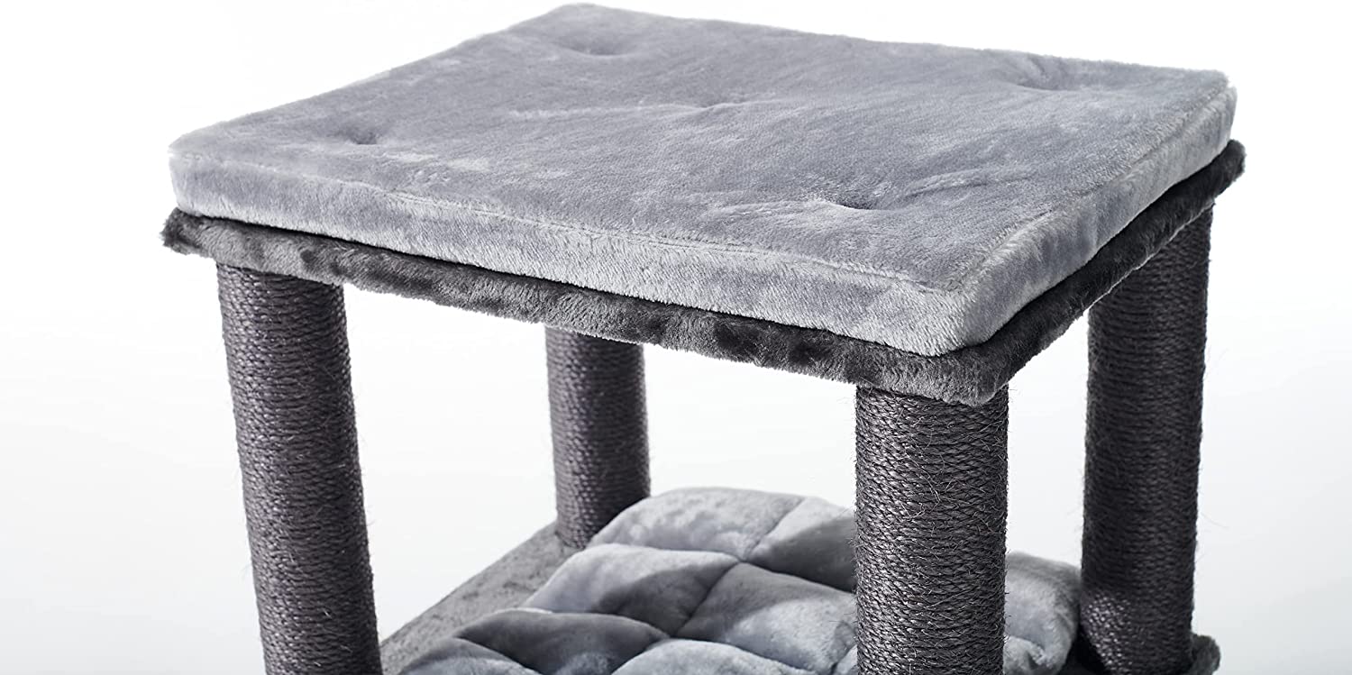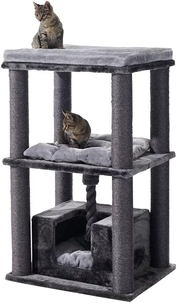 This spacious cat tree is equipped with chunky 9cm sisal scratching posts and several levels which your cat or mulitple cats will truly enjoy climbing and exploring.