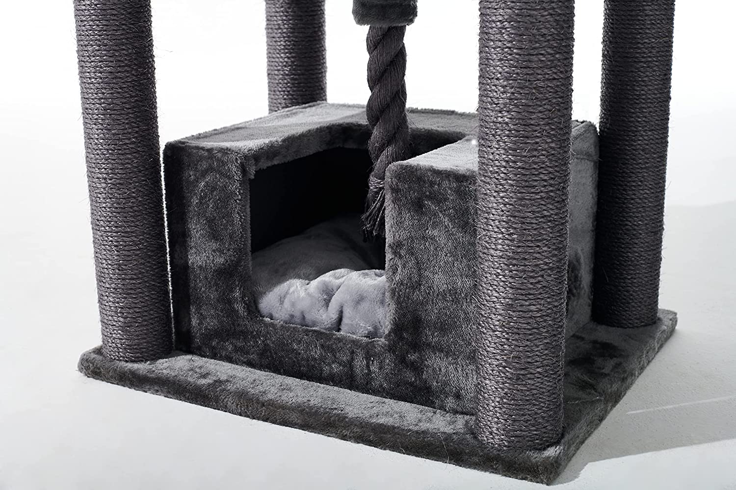 Scratching trees provide independent activity for your cat and often also offer a place of retreat. In addition, you protect your furnishings as you offer your cat a good alternative for grooming its claws. The “Brida” cat tree has a base area of 60 x 48 cm and is 90 cm high. It is equipped with Ø 9 cm sisal trunks as well as a cave on the floor, a rope hanging above it and 2 open lying areas.