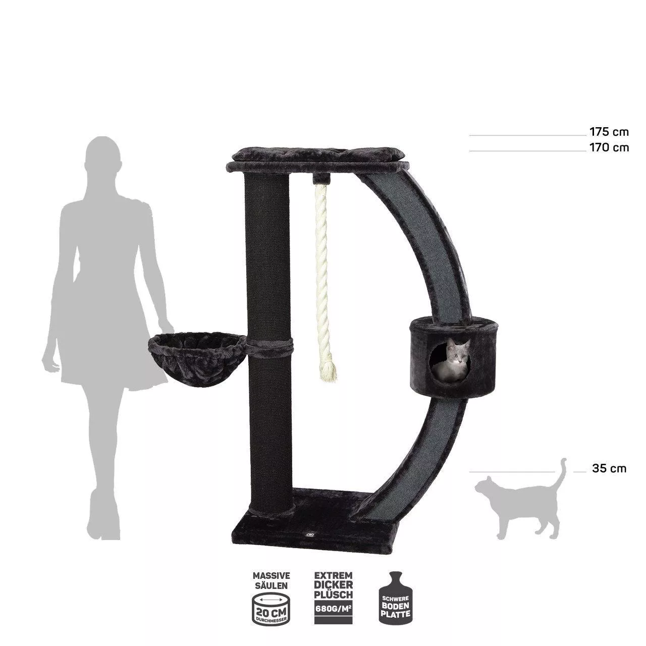 Size (W/D/H)approx. 60,0 x 157,0 x 170,0 cm Weight approx. 36,40 kg Tribe Ø20 cm Baseplate (W/D/H)approx. 70 x 60 x 4 cm Large lying place on top (B/T)approx. 70 x 50 cm Colors anthracite
