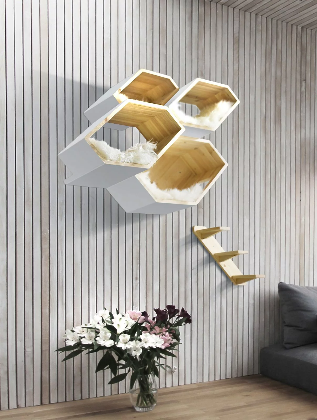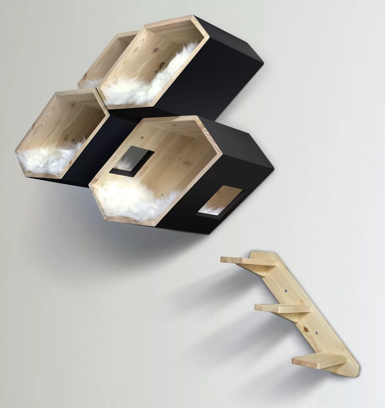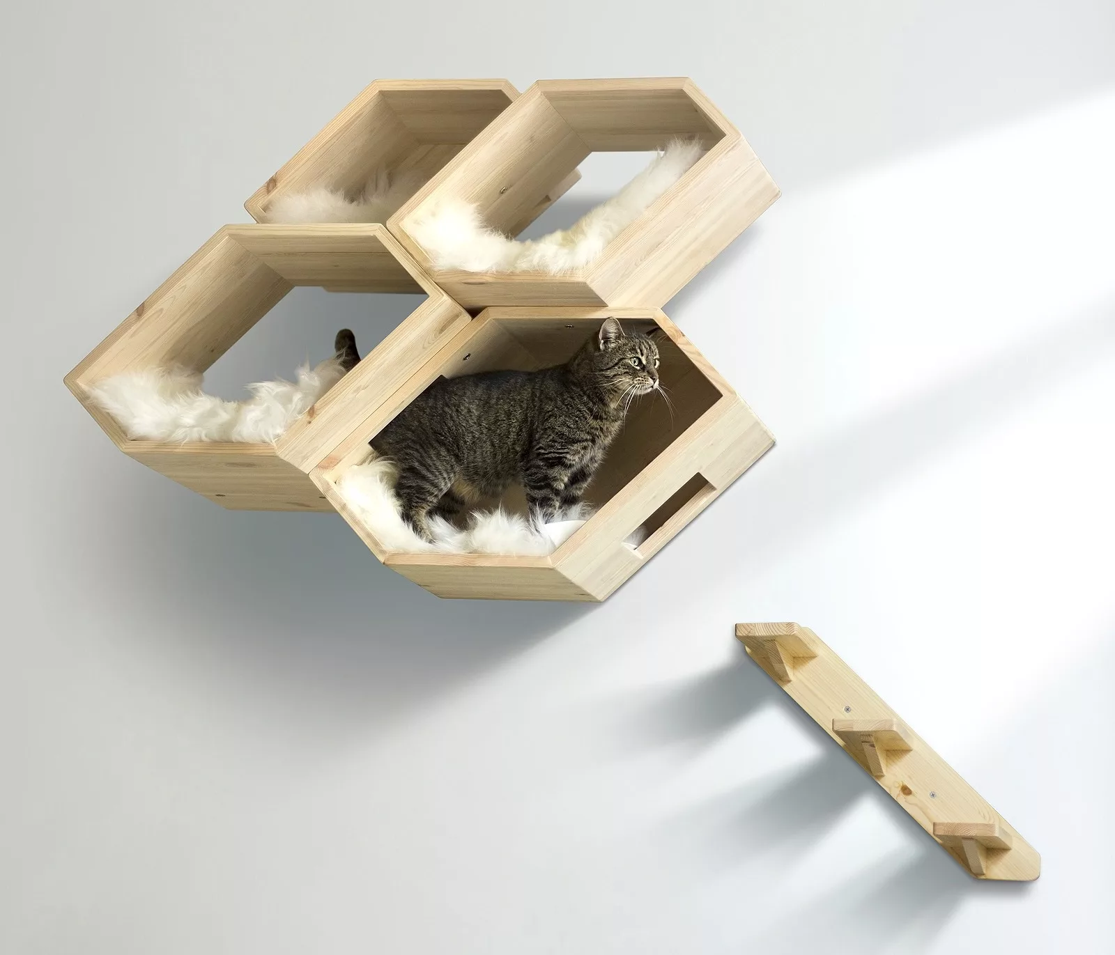 The Catissa hive can be easily mounted onto the wall with a ladder and will create a magical adventure playground for your cat to explore and sleep at their convenience.