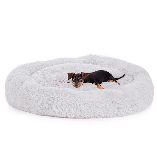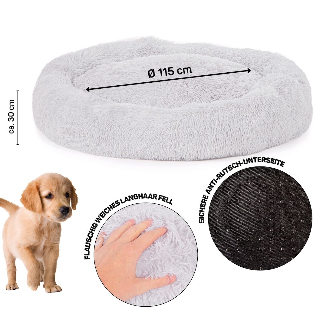 The stylish donut shape not only looks modern but also provides excellent comfort. The raised rim creates a protective, nest-like feeling that helps pets relax, while the spacious 115 cm size makes it suitable for dogs of all breeds and sizes. Its dark grey color blends seamlessly with any interior décor, ensuring this bed is as elegant as it is functional.