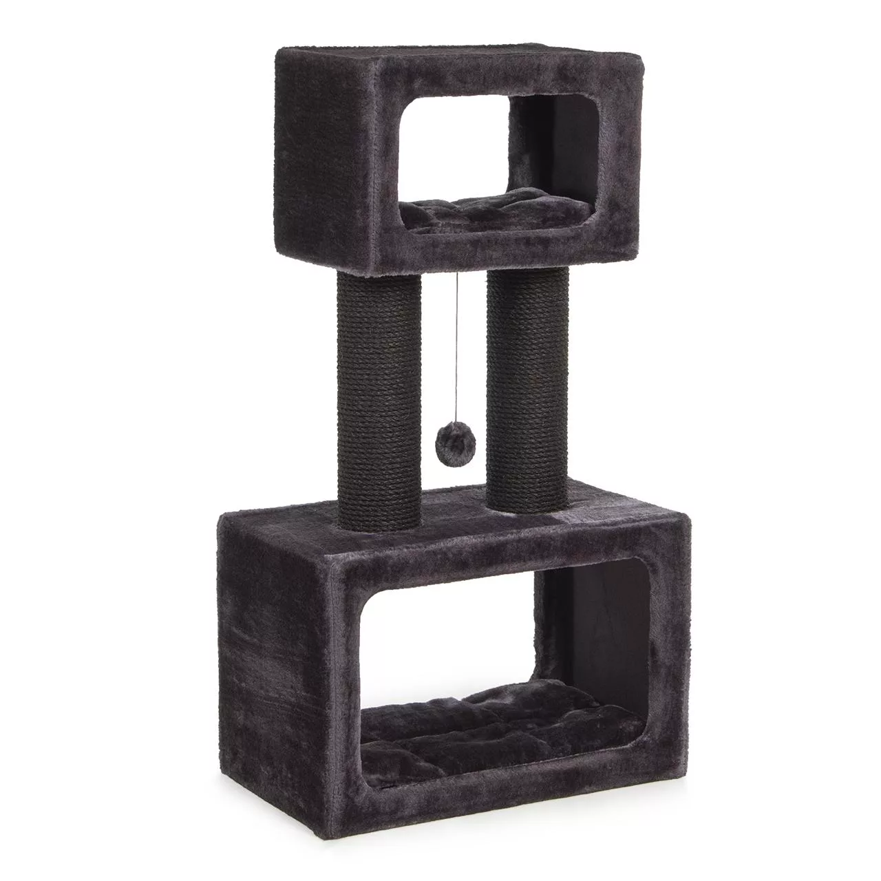 The size of the cave is approx. 60 x 36 x 40 cm. The two sisal scratching posts are solid and strong enough to withstand the intensive scratching of your cat and ensure excellent claw care and activity.