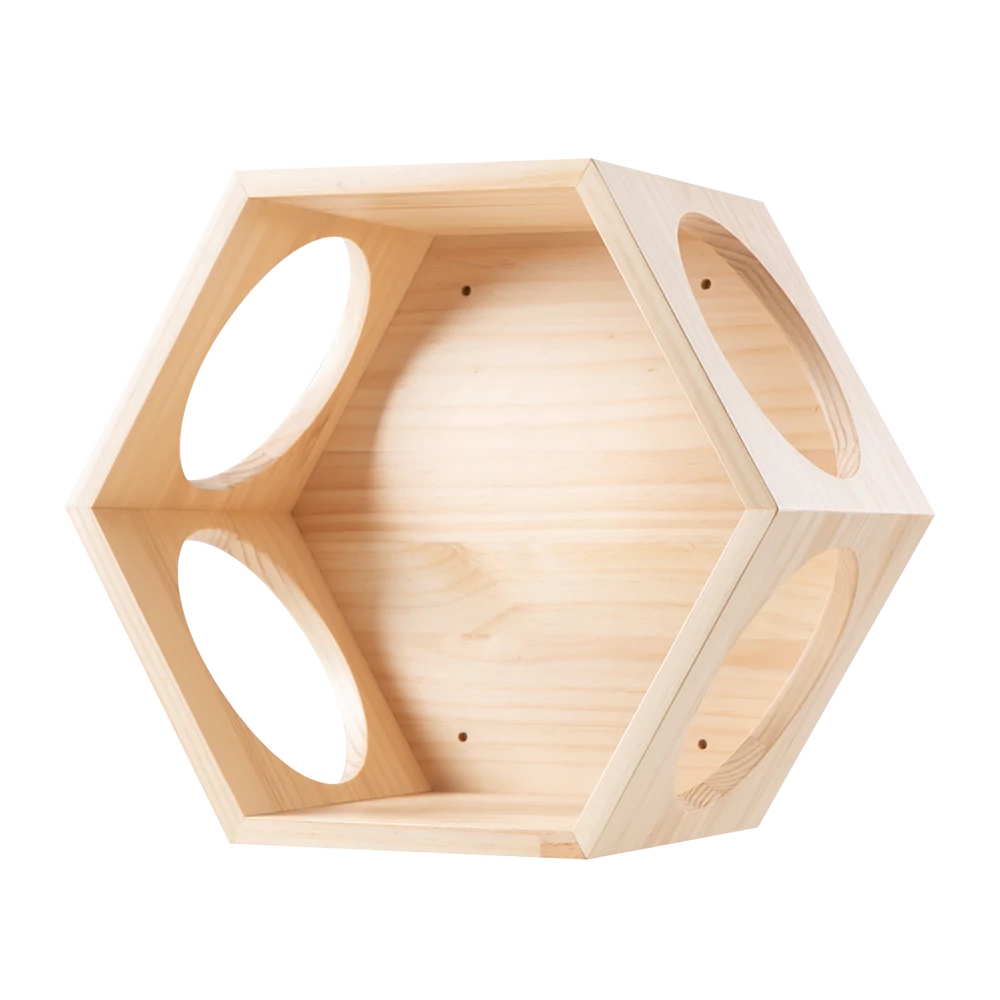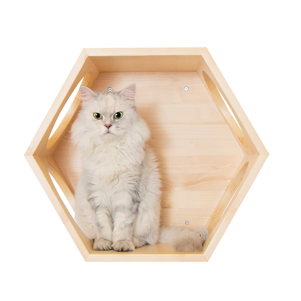 This stunning, handcrafted hexagon-shaped cat shelf includes 4 holes on each side so you can keep an eye on your cat enjoying themselves from every angle! They will also have the luxury of surveying their surrounding as well.