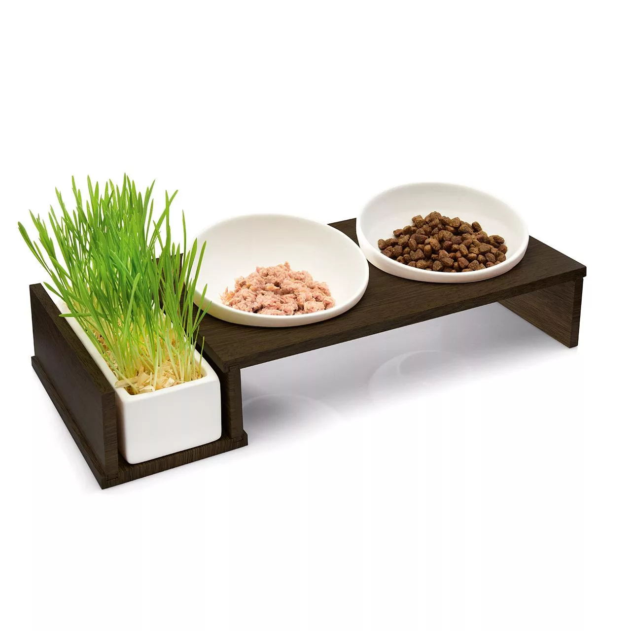 This immaculate food bar consists of 2 bowls and an extra long bowl which can be creatively used for cat grass or additional dry cat food.