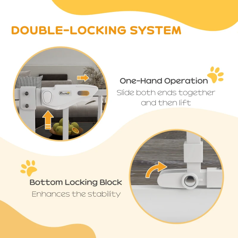 This PawHut extra-tall safety gate measures approximately 104.1 cm in height and adjusts in width from roughly 74 to 101 cm, making it ideal for larger openings such as stairwells or wide doorways. Constructed from sprayed steel for strength and durability, it includes a built-in cat flap at the bottom so smaller pets can pass through while the main gate remains closed, and an auto-close feature that activates when the door is opened under a certain angle (but stays open beyond a threshold). The gate uses adjustable screws for secure installation and features a smooth handle mechanism that lifts and slides for easy access. With bar spacing that ensures visibility but prevents small pets from escaping, it offers a blend of safety, convenience, and adaptability for multi-pet households or areas needing extra height protection.