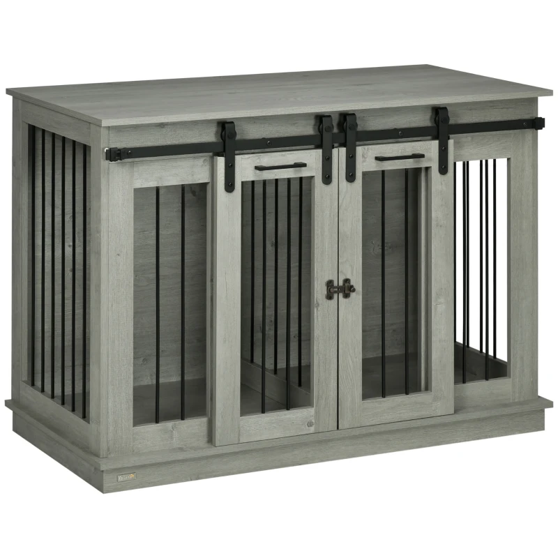 This furniture-style pet crate offers versatile housing for multiple pets, giving you the option to use it as one large enclosure for big dogs or divide it into two separate compartments for smaller pets. The frame is built with durable materials combining wood and reinforced steel mesh to ensure strength and airflow. Double doors provide flexible access from the front, and secure latches keep each section safely closed. The top surface is wide and solid, usable as a side table or storage shelf, while the interior provides enough space for a large pet when used as one open space, or two cozy chambers when separated. The finish is thoughtfully styled to complement living areas, and the design combines safety, comfort, and multi-pet functionality in one elegant piece.