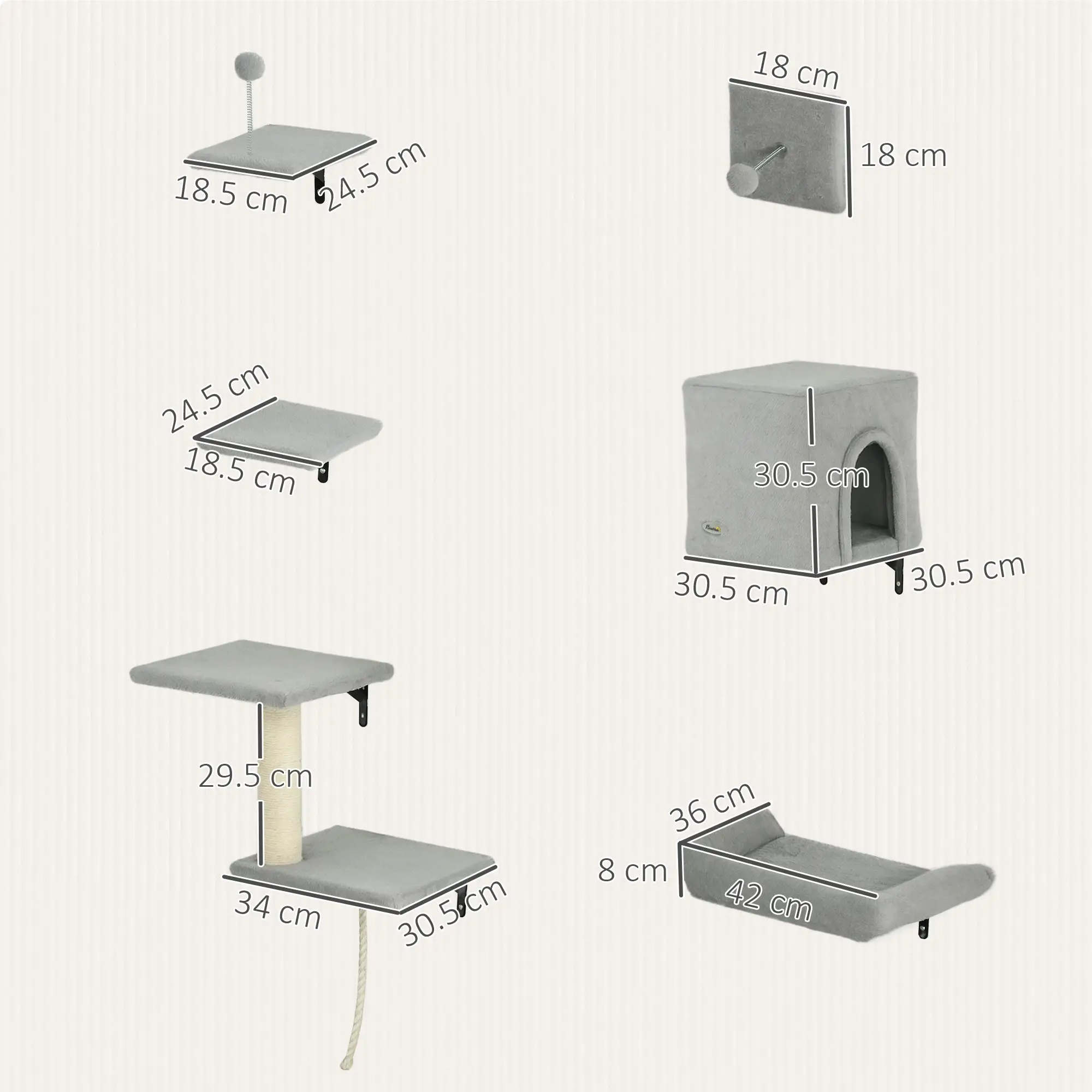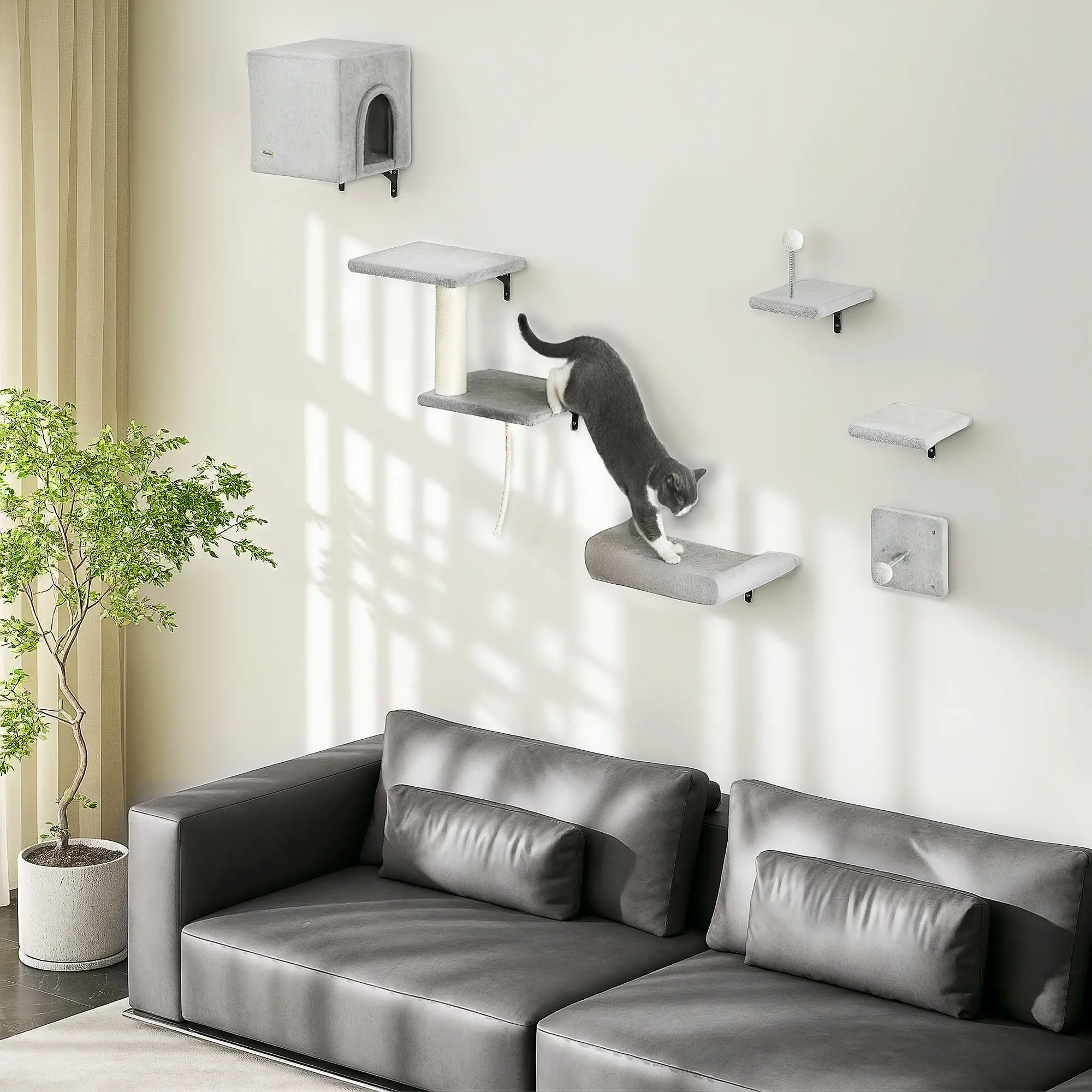The PawHut 6-Piece Cat Wall Shelves Set in grey offers a comprehensive solution for feline enrichment, combining functionality with modern aesthetics. This wall-mounted ensemble includes perches, a sisal post ladder, a cozy bed, a cat condo, a toy ball, and a rope, catering to your cat’s climbing, resting, scratching, and playing needs. Crafted from durable particle board with a metal support frame, each piece is covered in plush material, ensuring comfort while supporting cats up to 5 kg. The space-saving design frees up floor space, allowing your cat to survey their domain from elevated vantage points. With dimensions like the cat condo measuring 30.5W x 30.5D x 30.5H cm and the bed at 42W x 36D x 8H cm, this set is ideal for medium-sized cats. Assembly is required, and the set’s sleek grey finish seamlessly integrates into various home décors.