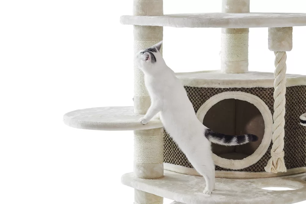 The spacious housing area which can be found halfway up this cat tree has been finished with scratchy sisal carpets and a convenient doorway which they can enter and exit at their will has been carefully positioned for maximum impact.