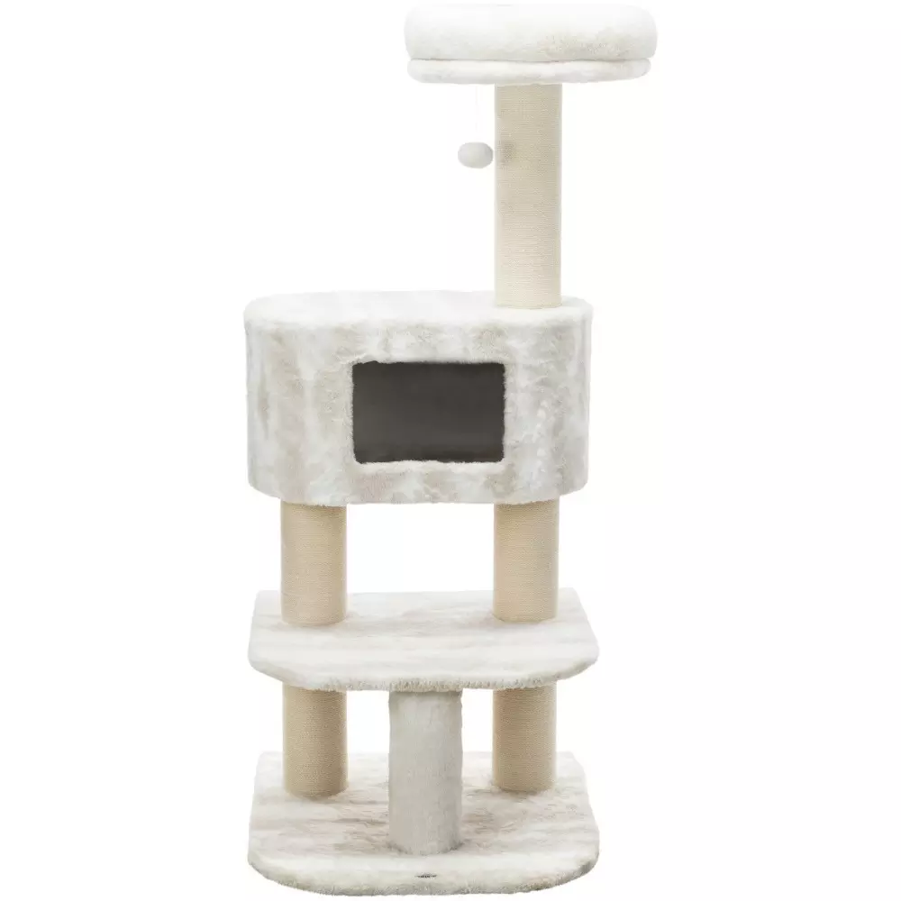 jute: ø 4 mm/long-haired plush (polyester): 310 g/m² cave fitted with plush/fleece (polyester) padded platform with removable cuddly bed colour: white/taupe Measurements: 140 cm Floor area: 58 × 58 cm Post: ø 11 cm Colour: white/taupe Thread Size: M8 Height: 140 cm