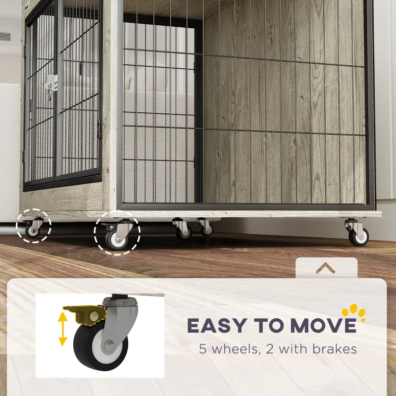This PawHut crate elegantly combines functionality and modern design, serving as both a robust shelter and stylish furniture piece for your home. Measuring approximately 100 cm in length, 60 cm in width, and standing 73.5 cm tall, it comfortably accommodates large dogs up to about 30 kg, while a sturdy top surface supports up to 20 kg—perfect for decor or essentials. Built with a reliable blend of particleboard and steel mesh, the crate features convenient double doors at the front plus a versatile side door that can be mounted on either side, secured with dependable latches for easy access and safe containment. Five smooth-rolling wheels—including two with locking brakes—ensure effortless mobility and stable placement. Thoughtfully engineered, this piece blends durability, comfort, and contemporary flair to provide your pet a safe haven that elevates your living space.