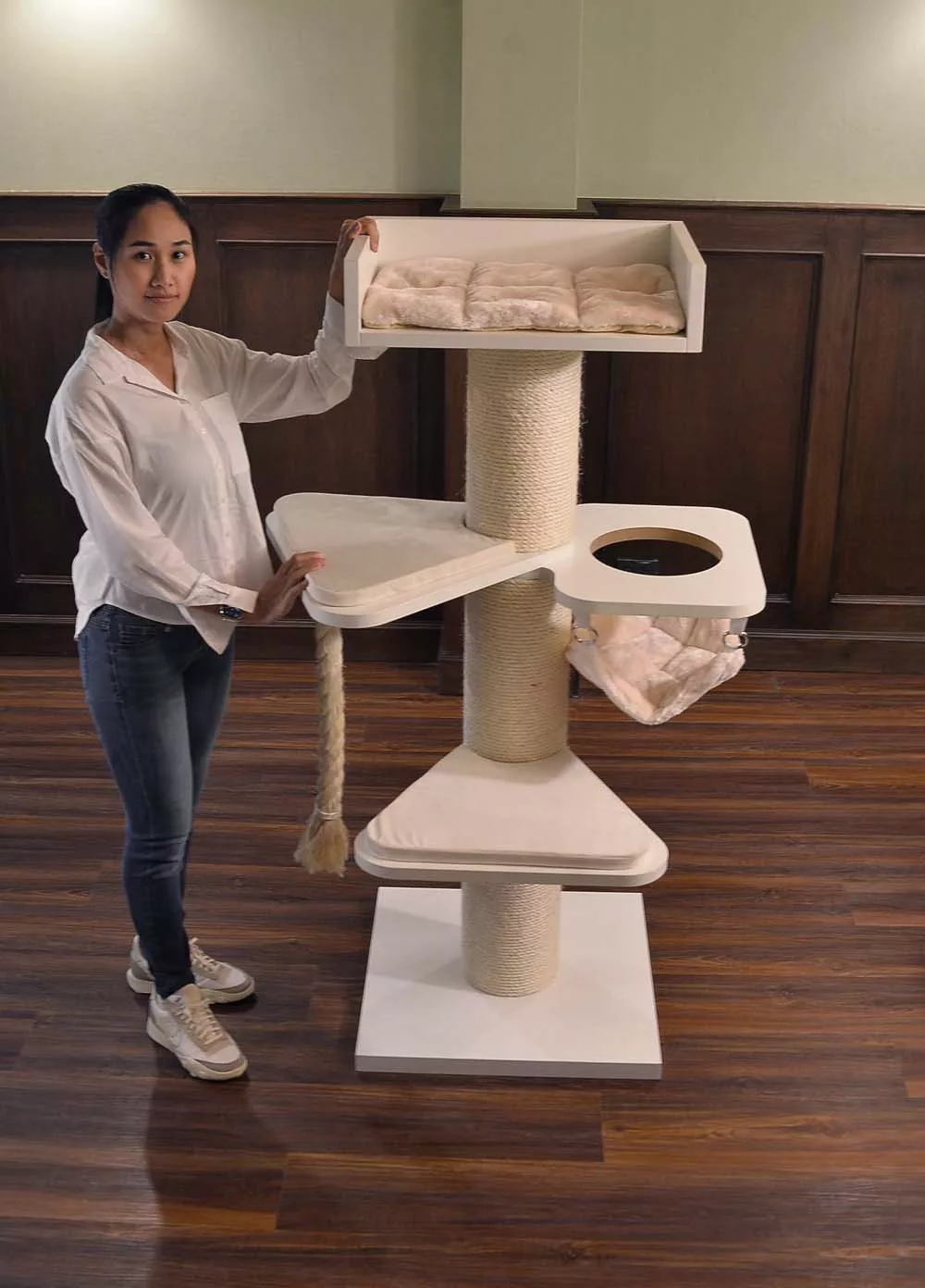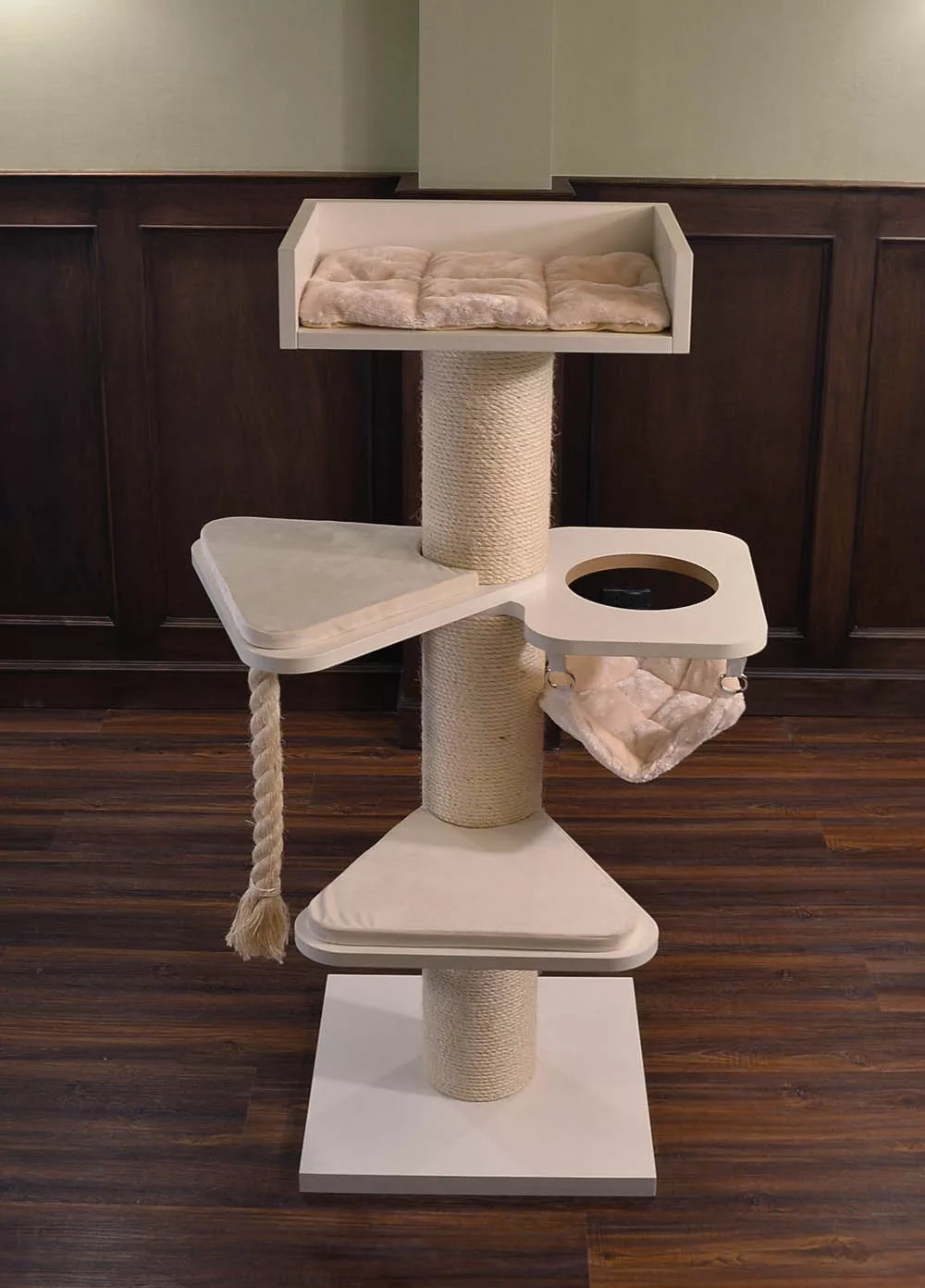 The beautifully designed natural wood melamine that finishes each of the platforms and litter areas of this cat tree is incredibly strong, splash resistant, scratch resistant and visually beautiful. No fabric tears or ripples will occur, which is a common problem found on previous models of this type and the modern style will truly become a statement in your home.