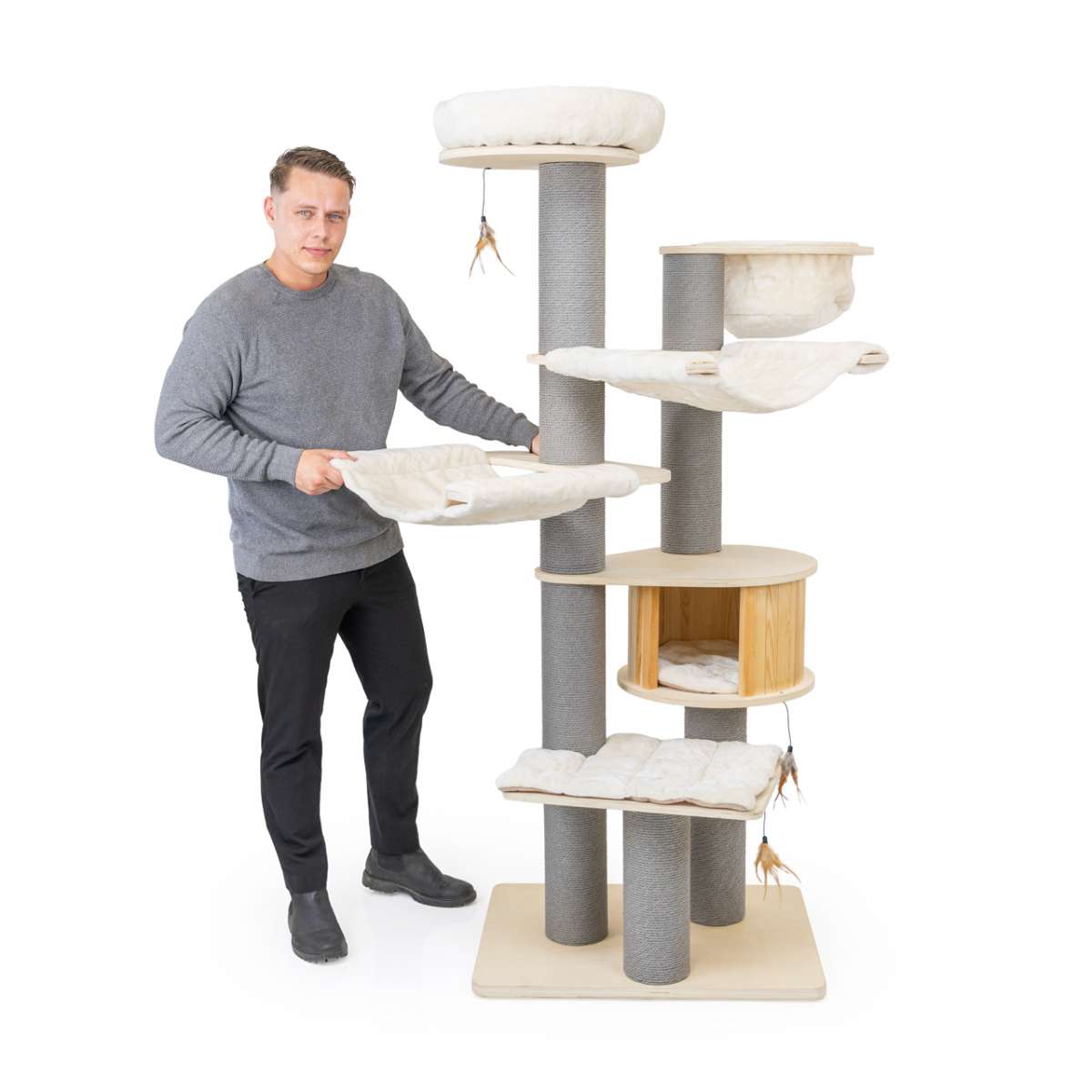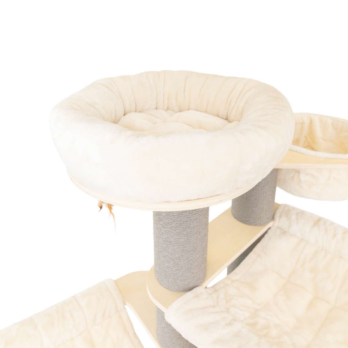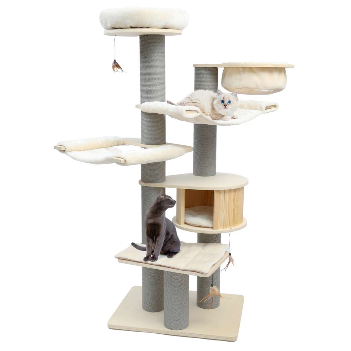 The central feature of the Avery is its thick, sisal-wrapped post—perfect for aggressive scratchers. This natural material allows cats to stretch and shred to their heart’s content while diverting attention from your furniture. Paired with plush, faux-fur-covered platforms in elegant beige and anthracite hues, it adds both tactile comfort for cats and chic design to your living space .