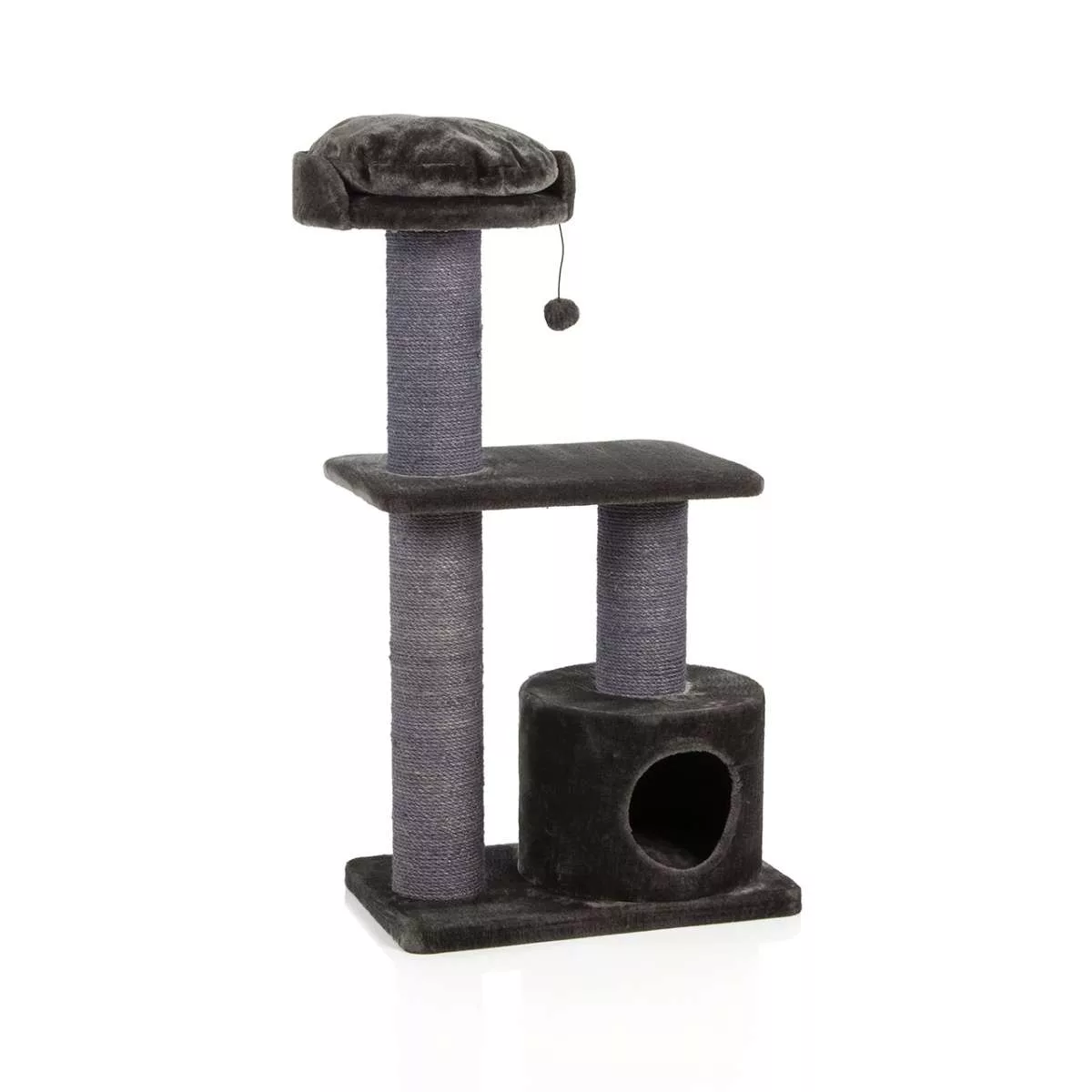 This clever design has three levels for cats to explore and a spacious housing area can be found on the ground level for private sleeps.