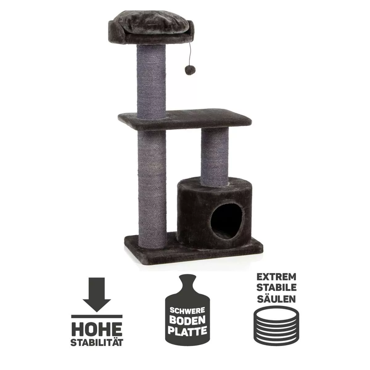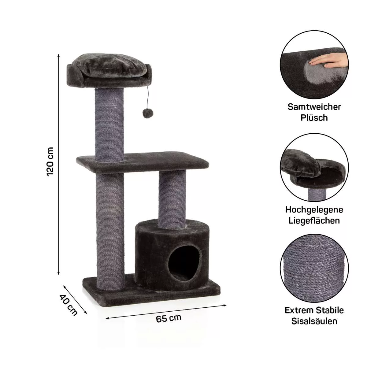 Dimensions: Solid base plate 65 x 40 x 4 cm Total width approx. 65 cm Total height approx. 120 cm Size of the lying surface: Ø 41 x 10 cm Size of the hutch: Ø 39 x 30 cm Weight: approx. 20 kg