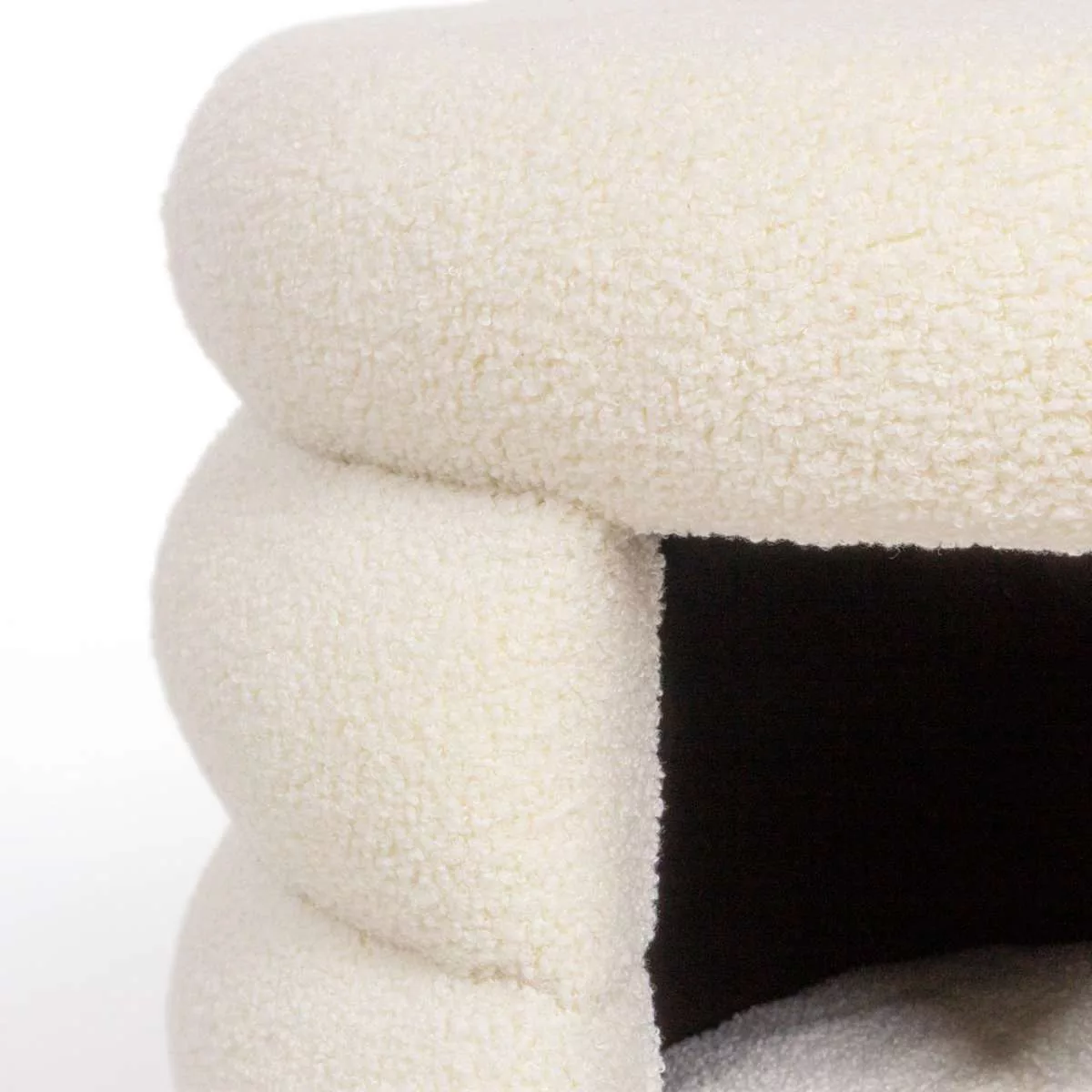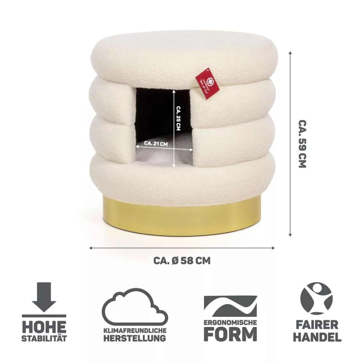 In summary, the Choupette cat cave by CanadianCat® is more than just a cat bed; it’s a statement of style and comfort. Its luxurious white teddy fabric, complemented by a stylish brass base, integrates seamlessly into any home setting. The interior cushioning and ample space cater to the comfort of both large and small cats, while its optimal height makes it a versatile piece of furniture for both human and feline use. The Choupette cat cave is indeed an exceptional choice for those who appreciate both luxury and functionality in their home furnishings.