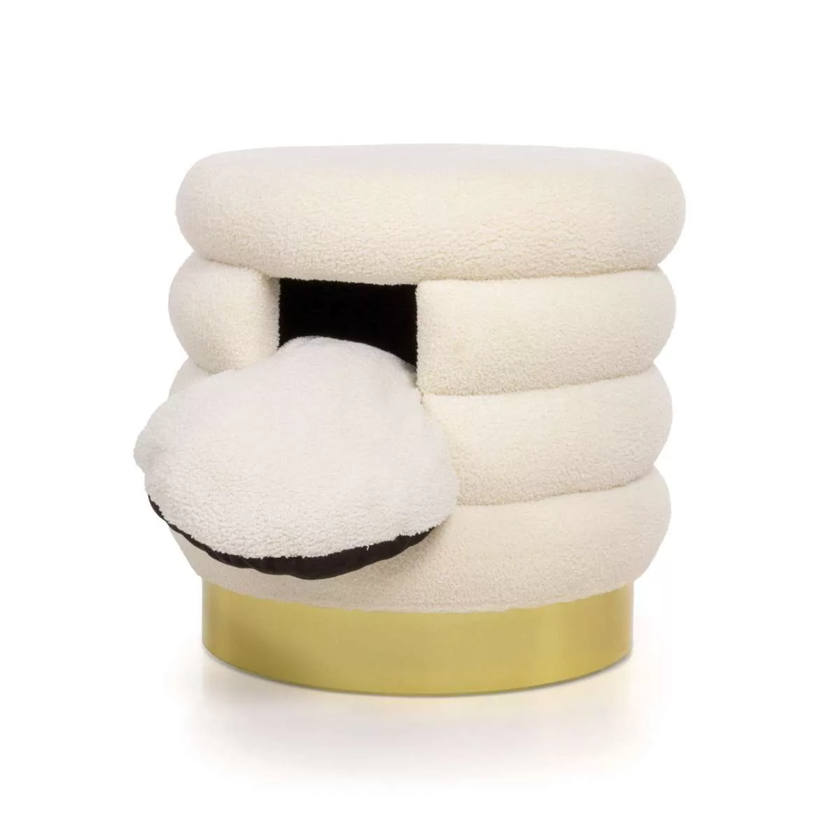 Introducing the “Choupette” cat cave from CanadianCat®, a luxurious and stylish addition to any cat lover’s home. Crafted with impeccable attention to detail, this unique piece of furniture combines functionality with high-end design, making it a standout piece in any room. The Choupette cat cave’s exterior is adorned with a plush white teddy fabric, giving it a soft, inviting look that appeals to both feline and human sensibilities. Its elegant brass base adds a touch of sophistication, ensuring that this cat cave isn’t just a comfortable retreat for your furry friend, but also a chic accessory for your home.
