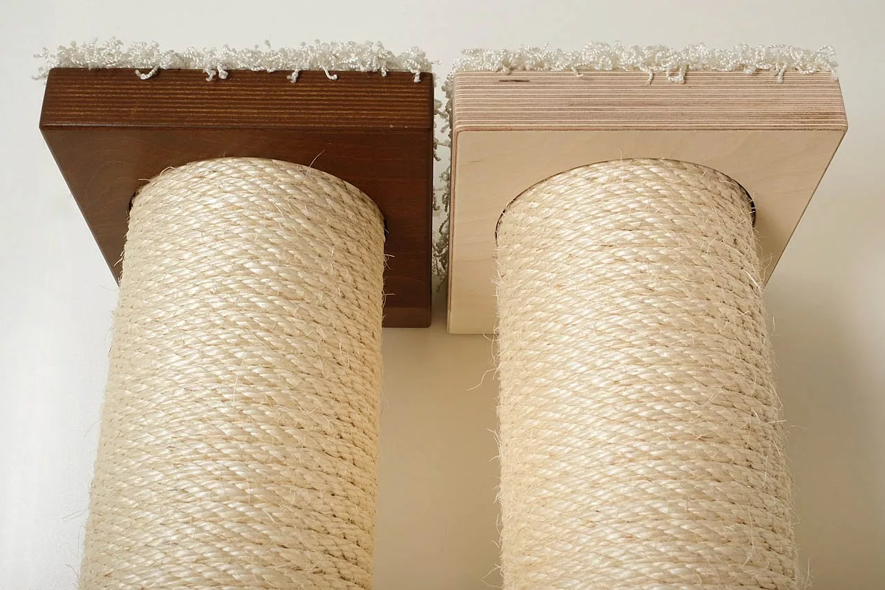 The climbing post is made of a sturdy plastic tube which is tightly wrapped with 10 mm sisal, without any use of solvents. Its diameter is about 150 mm, the mounting plate itself is about 40 mm thick plus the covering carpet.