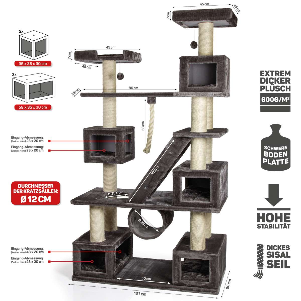 - 3 large cat caves (58 x 35 x 30 cm each) for quick retreats and comfortable nap times without the need to climb too high.