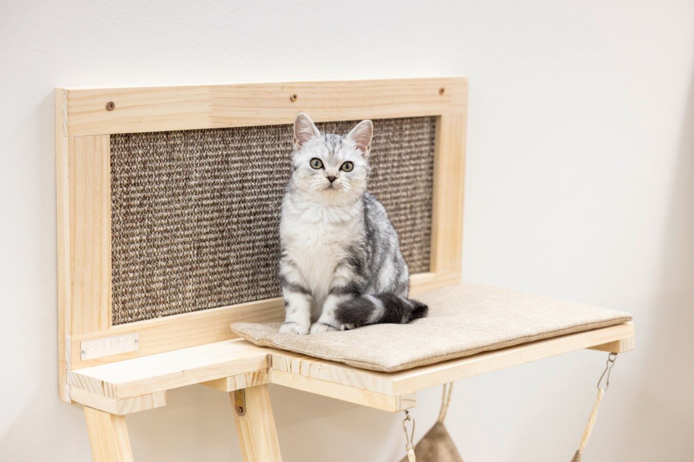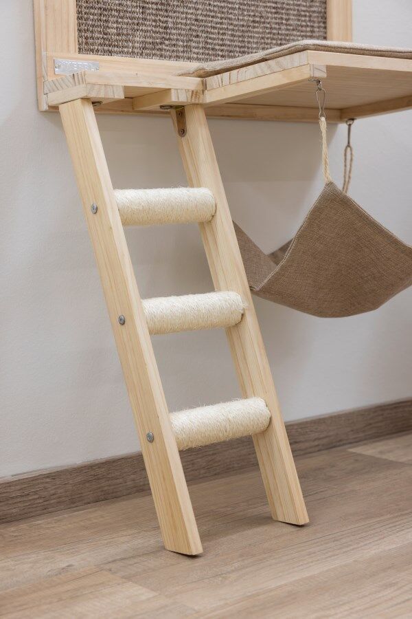 The “Timber Lying Surface” is a sleek, wall-mounted cat furniture piece that combines comfort, functionality, and space-saving design. It features a cozy plush hammock measuring 37 × 36 cm and a sturdy wooden platform (40 × 28.5 cm) with a removable, washable cushion for ultimate feline relaxation. Attached to the unit is a sisal scratching surface (50 × 21 cm), perfect for promoting healthy claw maintenance while protecting your furniture. Wooden steps wrapped in sisal lead your cat up to the elevated areas, encouraging climbing and play. Made from durable wood, sisal, and polyester, the set is designed to support cats up to 10 kg and includes all necessary wall-mounting hardware for secure installation. The hammock and cushion are machine washable at 30 °C, making it easy to keep your cat’s lounging area clean and fresh.