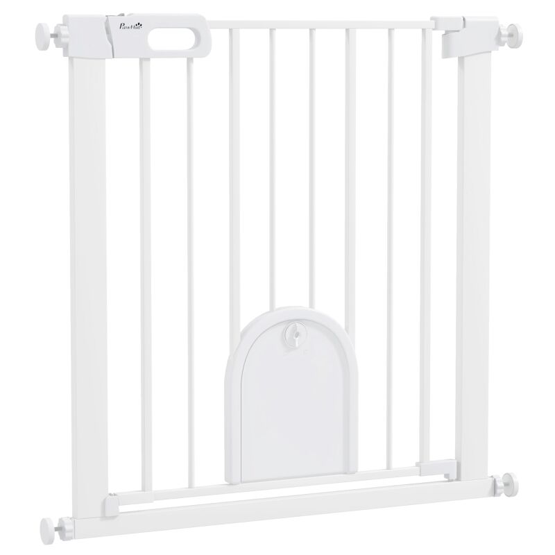 This PawHut safety gate is designed to fit openings between about 75 and 82 cm wide, standing approximately 76 cm tall, making it suitable for doorways, hallways, or stair entrances. Constructed from steel and ABS with a white, powder-coated finish, it features a double-locking system that requires pressing buttons on both ends before lifting to open, plus a bottom locking block for added stability. It includes a small cat flap to allow pets to pass through separately, which can also be kept open when needed. The gate is pressure mounted for tool-free installation, with adjustable screws to tighten it securely, and the main door has an auto-close mechanism that activates when it’s opened less than 90° (but stays open if pushed beyond 90°). Bar spacing is tight for safety, and the overall weight is about 4 kg.