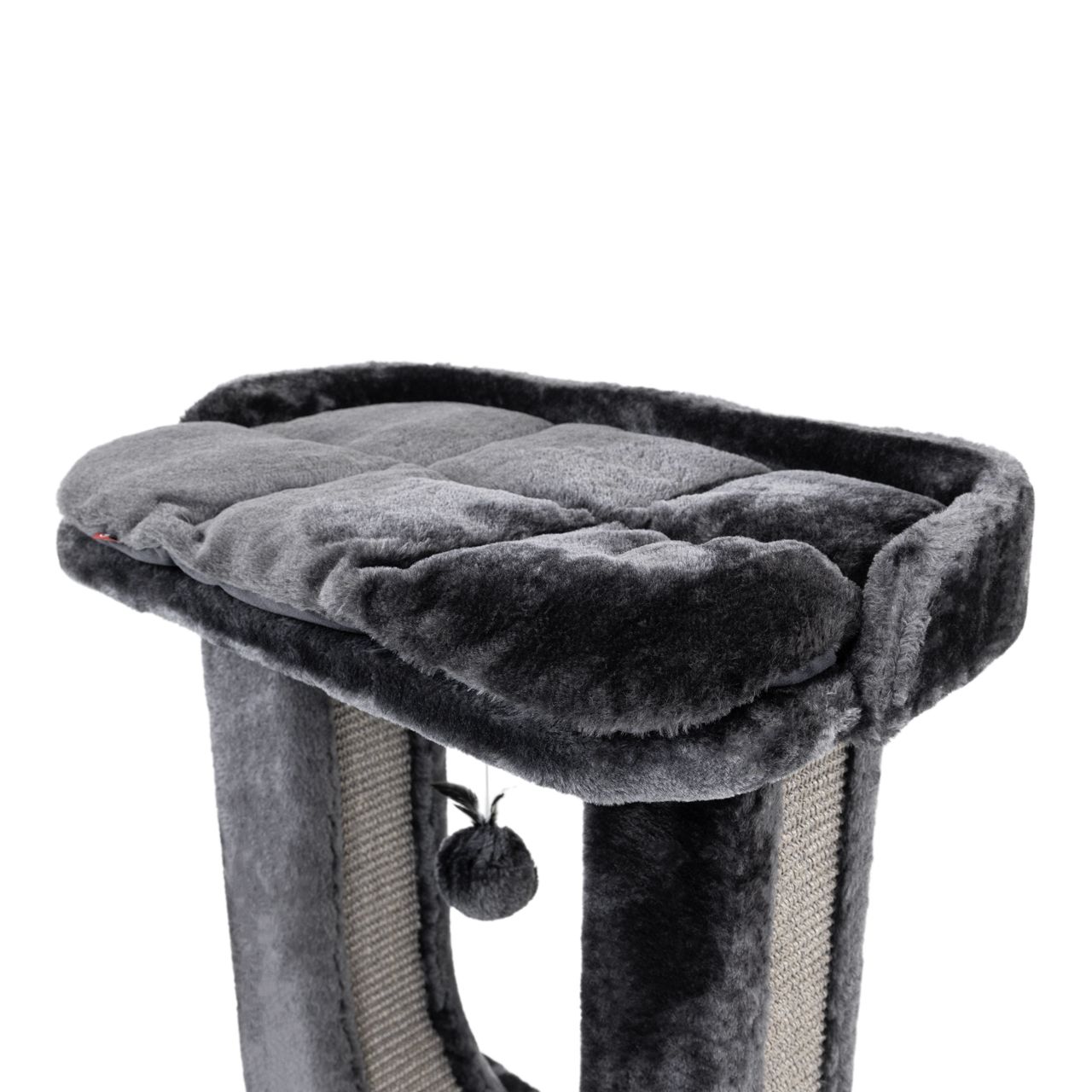 Both sides are covered in high-quality scratching carpet, offering generous surfaces for sharpening claws and stretching naturally—without the need for traditional sisal posts. At the top, a spacious lounging platform with a plush cushion provides the perfect vantage point for resting or keeping watch. A playful hanging pompom toy adds an interactive element, encouraging active play and swatting fun.