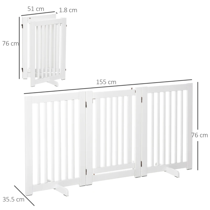 Crafted with a clean white MDF frame and sturdy hinged construction, this spot-lighting PawHut barrier extends effortlessly to fit spaces up to approximately 155 cm wide and stands around 76 cm tall. Its three-panel layout includes a central walk-through door secured with a top latch, offering pet owners convenient access without sacrificing safety. The open-slat design ensures airflow and visibility, while the gate remains freestanding—no need for wall fixes—and folds neatly into a compact form for easy storage or movement. Ideal for keeping small to medium pets contained in various areas of your home, its neutral, modern design also complements a wide range of interior styles.