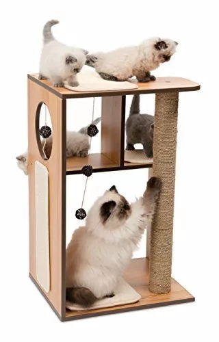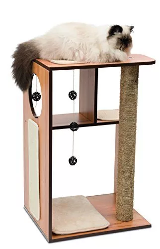 The Vesper V-Box Cat Tree in walnut styling is a stunning piece of cat furniture which serves multiple functions to keep your kitty happy, relaxed, and content. Whilst also maintaining a modern elegance to your homes decor.
