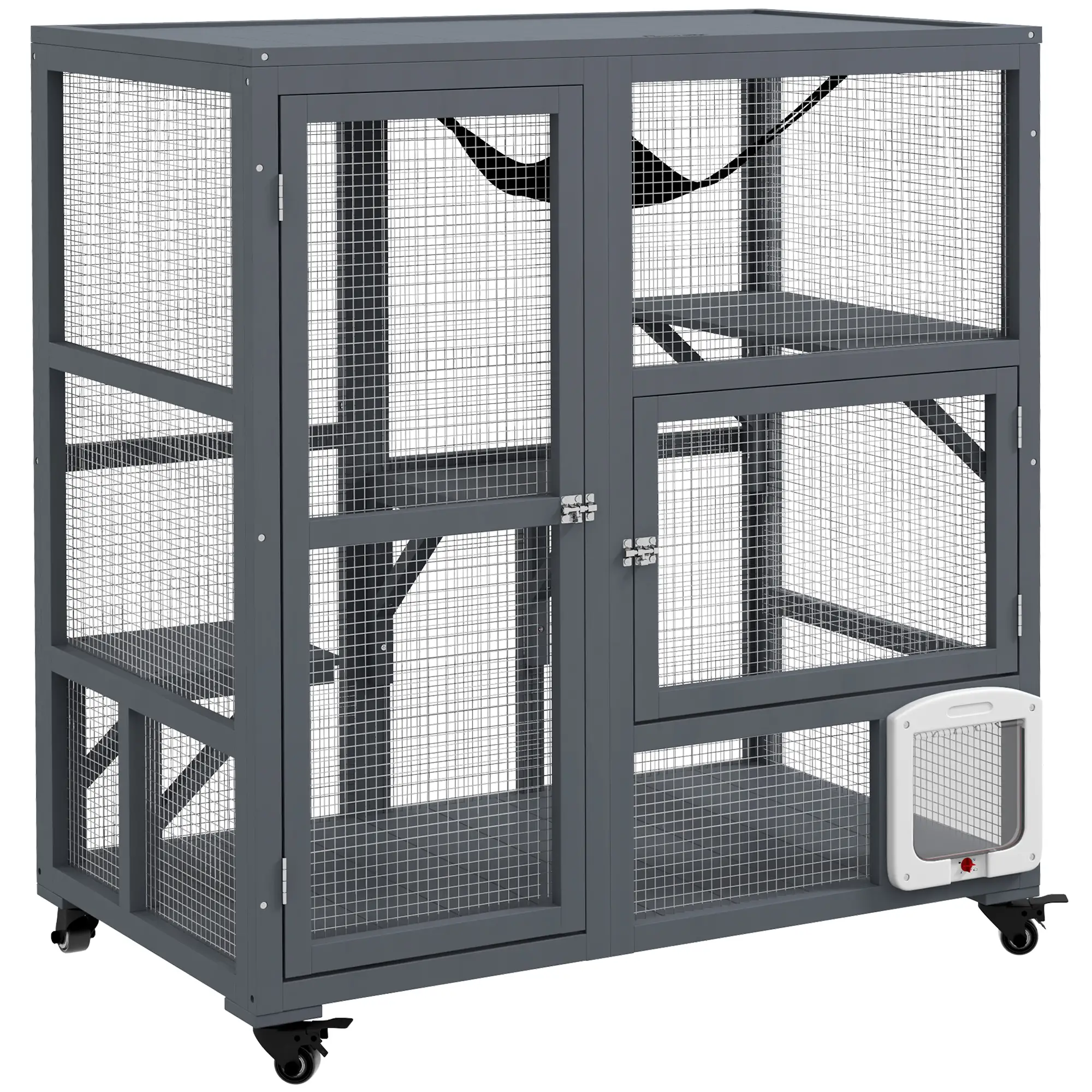 The overall height is approximately 188 centimetres, with a base footprint of roughly 91 by 65 centimetres. Each platform is designed to support cats weighing up to about 6 kilograms, and the structure can comfortably accommodate up to three small to medium-sized cats. Doors at the front and side offer easy access for cleaning or feeding, and the secure latches ensure cats stay safely inside.