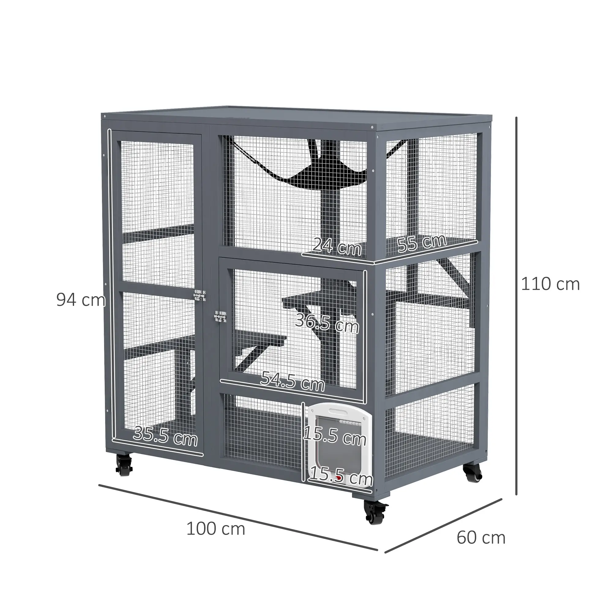 The multi-level interior features several wooden platforms for climbing, a cozy enclosed condo at the top for resting, ramps for easy access, and often includes a hanging hammock to provide additional lounging space. Mesh wire panels ensure your cat gets plenty of fresh air and visibility while staying protected from outside threats.